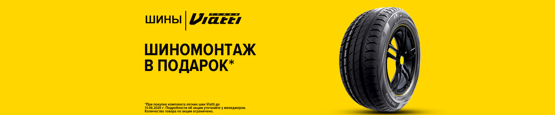 При покупке не менее 4 (четырех) штук летних шин бренда Viatti с посадочным диаметром 13-18 дюймов одной модели и типоразмера – ШИНОМОНТАЖ БЕСПЛАТНО!